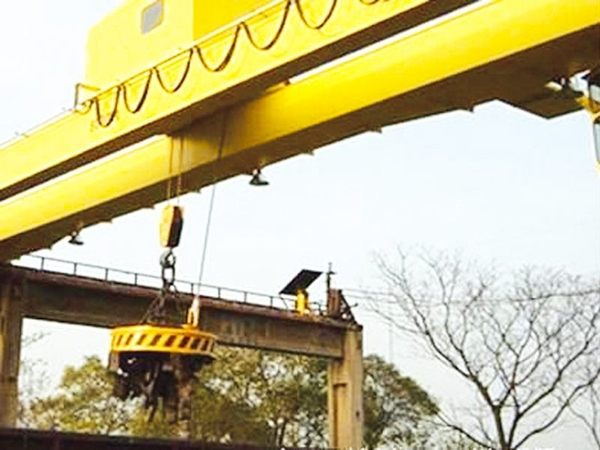 电磁桥式起重机的基本构造与吊钩桥式起重机相同,不同的是吊钩上挂1个直流起重电磁吸盘,用来吊运具有导磁性的黑色金属及其制品。通过装在司机室内的可控硅直流箱将交流电源转换为直流电源,然后再通过设在小车上的专用电缆卷筒,将直流电源用电缆送到电磁吸盘上。